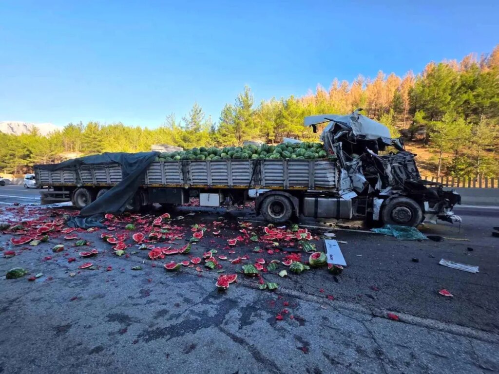 Adana- Pozantı otoyolunda karpuz yüklü tır öbür bir tıra geriden çarparak devrildi. Karpuzlar otoyola saçıldı.