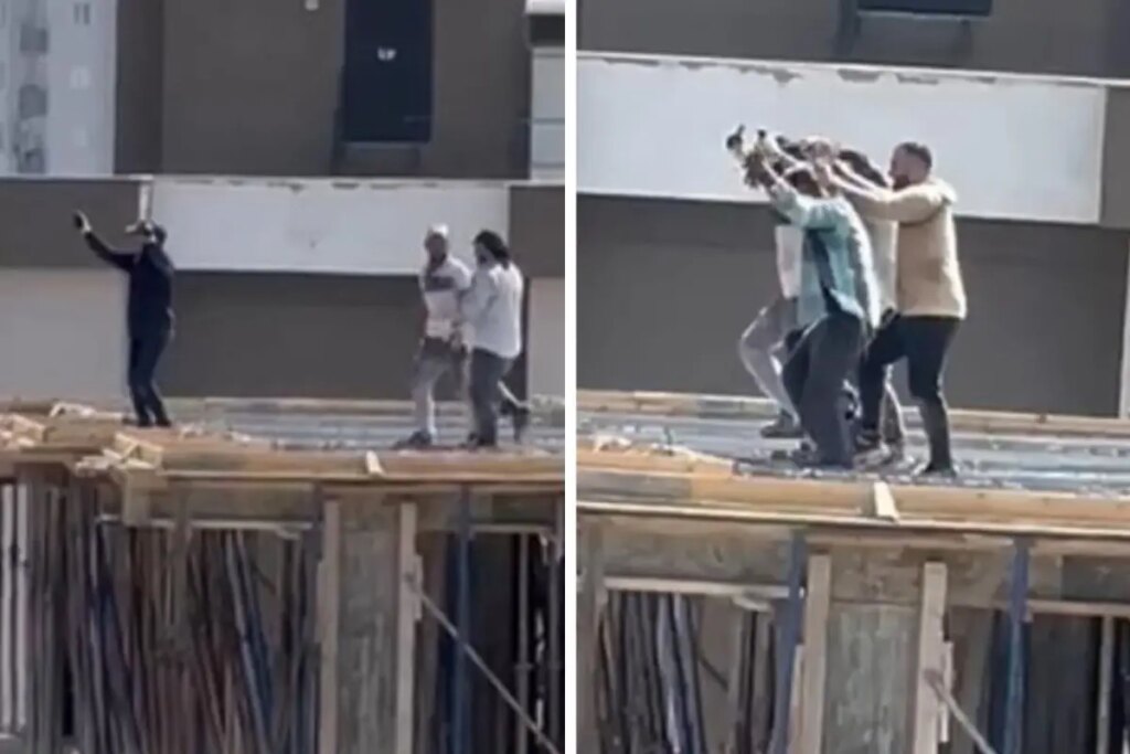 Adana‘da bir inşaatın 10’uncu katında çalışan çalışanlar arabadan gelen müzik sesiyle birlikte oldukları yerde halay çekmeye başladı.
